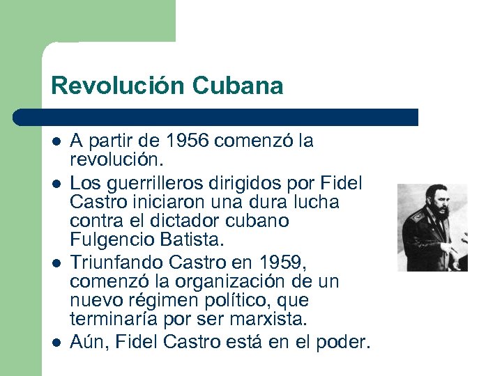 Revolución Cubana l l A partir de 1956 comenzó la revolución. Los guerrilleros dirigidos por Fidel Castro iniciaron una dura lucha contra el dictador cubano Fulgencio Batista. Triunfando Castro en 1959, comenzó la organización de un nuevo régimen político, que terminaría por ser marxista. Aún, Fidel Castro está en el poder.