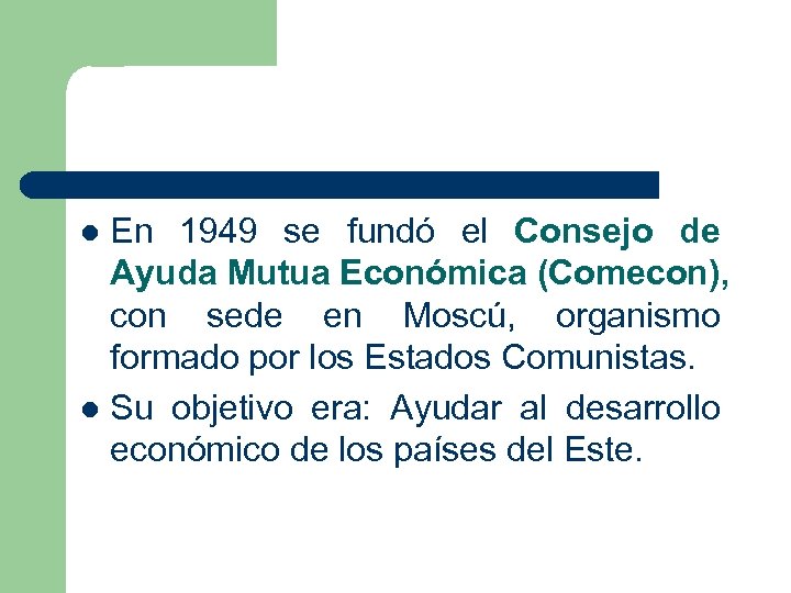 En 1949 se fundó el Consejo de Ayuda Mutua Económica (Comecon), con sede en Moscú, organismo formado por los Estados Comunistas. l Su objetivo era: Ayudar al desarrollo económico de los países del Este. l
