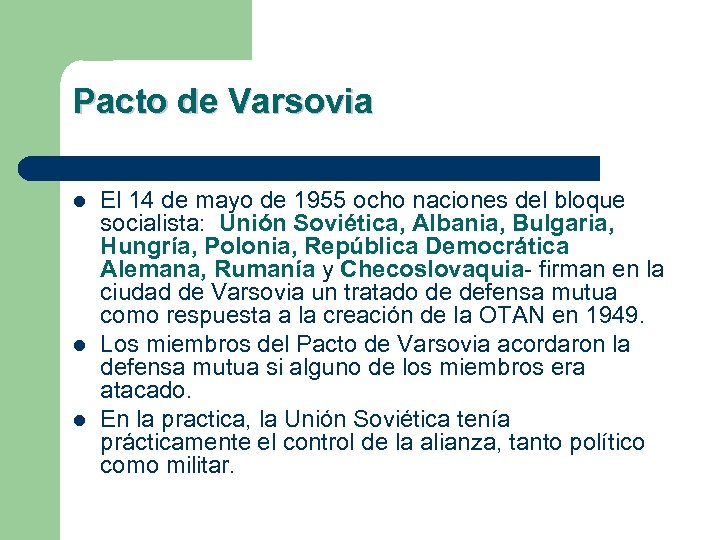 Pacto de Varsovia l l l El 14 de mayo de 1955 ocho naciones del bloque socialista: Unión Soviética, Albania, Bulgaria, Hungría, Polonia, República Democrática Alemana, Rumanía y Checoslovaquia- firman en la ciudad de Varsovia un tratado de defensa mutua como respuesta a la creación de la OTAN en 1949. Los miembros del Pacto de Varsovia acordaron la defensa mutua si alguno de los miembros era atacado. En la practica, la Unión Soviética tenía prácticamente el control de la alianza, tanto político como militar.