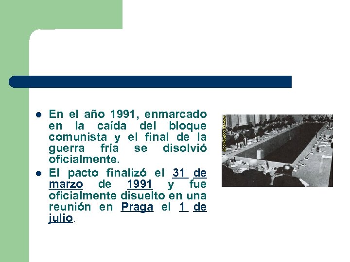 l l En el año 1991, enmarcado en la caída del bloque comunista y el final de la guerra fría se disolvió oficialmente. El pacto finalizó el 31 de marzo de 1991 y fue oficialmente disuelto en una reunión en Praga el 1 de julio.