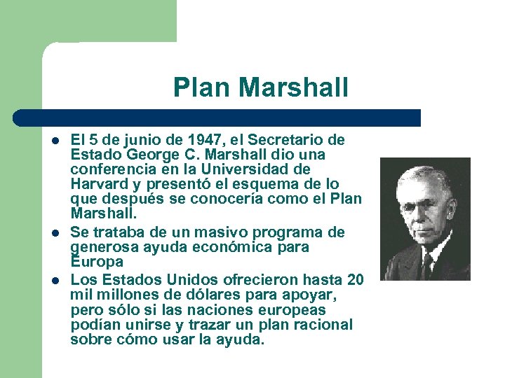 Plan Marshall l El 5 de junio de 1947, el Secretario de Estado George C. Marshall dio una conferencia en la Universidad de Harvard y presentó el esquema de lo que después se conocería como el Plan Marshall. Se trataba de un masivo programa de generosa ayuda económica para Europa Los Estados Unidos ofrecieron hasta 20 millones de dólares para apoyar, pero sólo si las naciones europeas podían unirse y trazar un plan racional sobre cómo usar la ayuda.