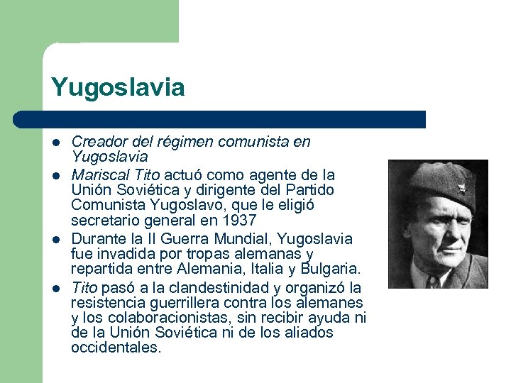 Yugoslavia l l Creador del régimen comunista en Yugoslavia Mariscal Tito actuó como agente de la Unión Soviética y dirigente del Partido Comunista Yugoslavo, que le eligió secretario general en 1937 Durante la II Guerra Mundial, Yugoslavia fue invadida por tropas alemanas y repartida entre Alemania, Italia y Bulgaria. Tito pasó a la clandestinidad y organizó la resistencia guerrillera contra los alemanes y los colaboracionistas, sin recibir ayuda ni de la Unión Soviética ni de los aliados occidentales.
