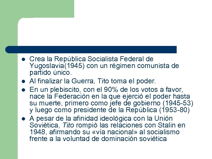 l l Crea la República Socialista Federal de Yugoslavia(1945) con un régimen comunista de partido único. Al finalizar la Guerra, Tito toma el poder. En un plebiscito, con el 90% de los votos a favor, nace la Federación en la que ejerció el poder hasta su muerte, primero como jefe de gobierno (1945 -53) y luego como presidente de la República (1953 -80) A pesar de la afinidad ideológica con la Unión Soviética, Tito rompió las relaciones con Stalin en 1948, afirmando su «vía nacional» al socialismo frente a la voluntad de dominación soviética
