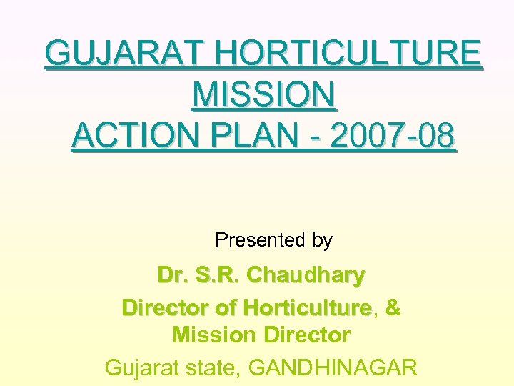 GUJARAT HORTICULTURE MISSION ACTION PLAN - 2007 -08 Presented by Dr. S. R. Chaudhary Director of Horticulture, & Director of Horticulture Mission Director Gujarat state, GANDHINAGAR