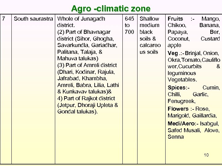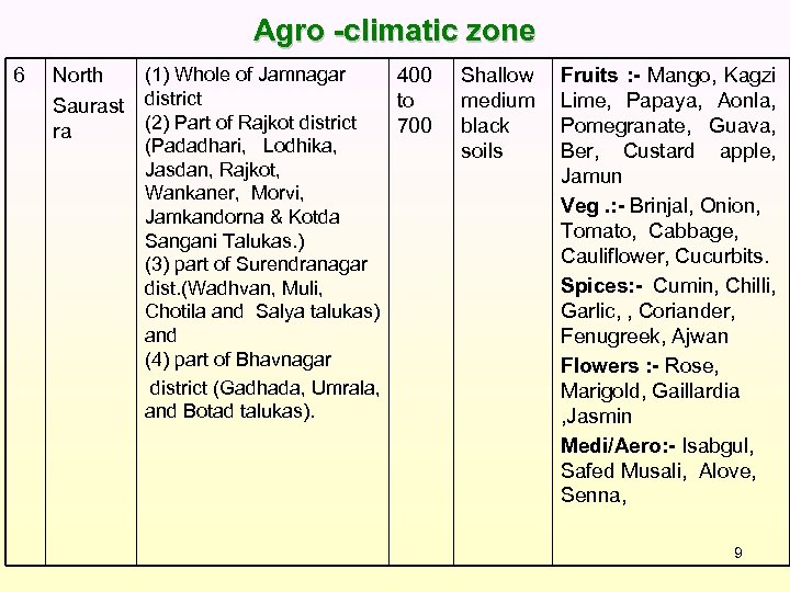 Agro -climatic zone 6 (1) Whole of Jamnagar North Saurast district (2) Part of Rajkot district ra (Padadhari, Lodhika, Jasdan, Rajkot, Wankaner, Morvi, Jamkandorna & Kotda Sangani Talukas. ) (3) part of Surendranagar dist. (Wadhvan, Muli, Chotila and Salya talukas) and (4) part of Bhavnagar district (Gadhada, Umrala, and Botad talukas). 400 to 700 Shallow medium black soils Fruits : - Mango, Kagzi Lime, Papaya, Aonla, Pomegranate, Guava, Ber, Custard apple, Jamun Veg. : - Brinjal, Onion, Tomato, Cabbage, Cauliflower, Cucurbits. Spices: - Cumin, Chilli, Garlic, , Coriander, Fenugreek, Ajwan Flowers : - Rose, Marigold, Gaillardia , Jasmin Medi/Aero: - Isabgul, Safed Musali, Alove, Senna, 9