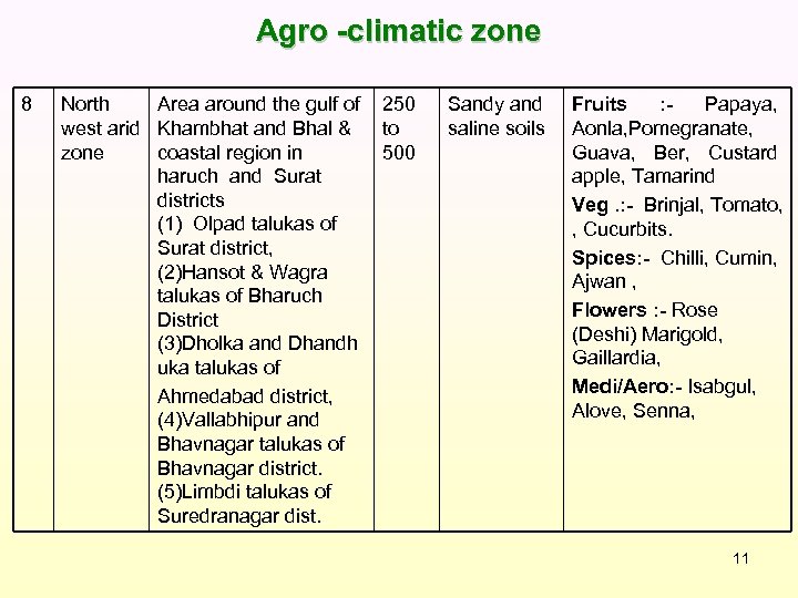 Agro -climatic zone 8 North Area around the gulf of 250 west arid Khambhat and Bhal & to zone coastal region in 500 haruch and Surat districts (1) Olpad talukas of Surat district, (2)Hansot & Wagra talukas of Bharuch District (3)Dholka and Dhandh uka talukas of Ahmedabad district, (4)Vallabhipur and Bhavnagar talukas of Bhavnagar district. (5)Limbdi talukas of Suredranagar dist. Sandy and saline soils Fruits : - Papaya, Aonla, Pomegranate, Guava, Ber, Custard apple, Tamarind Veg. : - Brinjal, Tomato, , Cucurbits. Spices: - Chilli, Cumin, Ajwan , Flowers : - Rose (Deshi) Marigold, Gaillardia, Medi/Aero: - Isabgul, Alove, Senna, 11