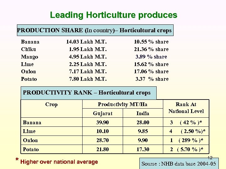 Leading Horticulture produces PRODUCTION SHARE (In country)– Horticultural crops Banana Chiku Mango Lime Onion Potato 14. 03 Lakh M. T. 1. 95 Lakh M. T. 4. 95 Lakh M. T. 2. 25 Lakh M. T. 7. 17 Lakh M. T. 7. 80 Lakh M. T. 10. 55 % share 21. 36 % share 3. 89 % share 15. 62 % share 17. 06 % share 3. 37 % share PRODUCTIVITY RANK – Horticultural crops Crop Productivity MT/Ha Gujarat India Rank At National Level Banana 39. 90 28. 00 3 ( 42 % )* Lime 10. 10 9. 85 4 ( 2. 50 %)* Onion 28. 70 9. 90 1 ( 289 % )* Potato 21. 80 17. 30 2 ( 5. 70 % )* * Higher over national average 12 Sourse : NHB data base 2004 -05