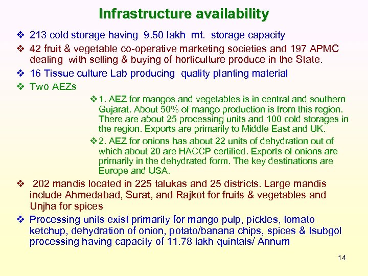 Infrastructure availability v 213 cold storage having 9. 50 lakh mt. storage capacity v 42 fruit & vegetable co-operative marketing societies and 197 APMC dealing with selling & buying of horticulture produce in the State. v 16 Tissue culture Lab producing quality planting material v Two AEZs v 1. AEZ for mangos and vegetables is in central and southern Gujarat. About 50% of mango production is from this region. There about 25 processing units and 100 cold storages in the region. Exports are primarily to Middle East and UK. v 2. AEZ for onions has about 22 units of dehydration out of which about 20 are HACCP certified. Exports of onions are primarily in the dehydrated form. The key destinations are Europe and USA. v 202 mandis located in 225 talukas and 25 districts. Large mandis include Ahmedabad, Surat, and Rajkot for fruits & vegetables and Unjha for spices v Processing units exist primarily for mango pulp, pickles, tomato ketchup, dehydration of onion, potato/banana chips, spices & Isubgol processing having capacity of 11. 78 lakh quintals/ Annum 14