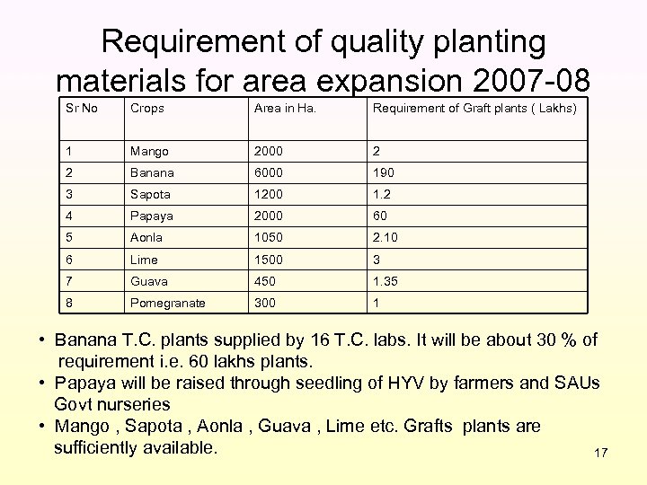 Requirement of quality planting materials for area expansion 2007 -08 Sr No Crops Area in Ha. Requirement of Graft plants ( Lakhs) 1 Mango 2000 2 2 Banana 6000 190 3 Sapota 1200 1. 2 4 Papaya 2000 60 5 Aonla 1050 2. 10 6 Lime 1500 3 7 Guava 450 1. 35 8 Pomegranate 300 1 • Banana T. C. plants supplied by 16 T. C. labs. It will be about 30 % of requirement i. e. 60 lakhs plants. • Papaya will be raised through seedling of HYV by farmers and SAUs Govt nurseries • Mango , Sapota , Aonla , Guava , Lime etc. Grafts plants are sufficiently available. 17