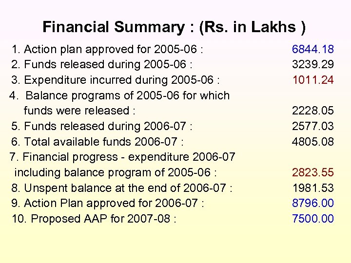 Financial Summary : (Rs. in Lakhs ) 1. Action plan approved for 2005 -06 : 2. Funds released during 2005 -06 : 3. Expenditure incurred during 2005 -06 : 4. Balance programs of 2005 -06 for which funds were released : 5. Funds released during 2006 -07 : 6. Total available funds 2006 -07 : 7. Financial progress - expenditure 2006 -07 including balance program of 2005 -06 : 8. Unspent balance at the end of 2006 -07 : 9. Action Plan approved for 2006 -07 : 10. Proposed AAP for 2007 -08 : 6844. 18 3239. 29 1011. 24 2228. 05 2577. 03 4805. 08 2823. 55 1981. 53 8796. 00 7500. 00