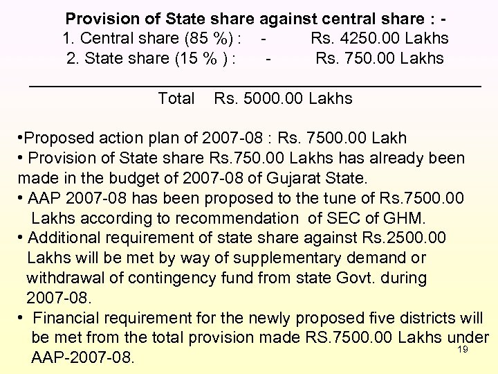 Provision of State share against central share : 1. Central share (85 %) : Rs. 4250. 00 Lakhs 2. State share (15 % ) : Rs. 750. 00 Lakhs _________________________ Total Rs. 5000. 00 Lakhs • Proposed action plan of 2007 -08 : Rs. 7500. 00 Lakh • Provision of State share Rs. 750. 00 Lakhs has already been made in the budget of 2007 -08 of Gujarat State. • AAP 2007 -08 has been proposed to the tune of Rs. 7500. 00 Lakhs according to recommendation of SEC of GHM. • Additional requirement of state share against Rs. 2500. 00 Lakhs will be met by way of supplementary demand or withdrawal of contingency fund from state Govt. during 2007 -08. • Financial requirement for the newly proposed five districts will be met from the total provision made RS. 7500. 00 Lakhs under 19 AAP-2007 -08.