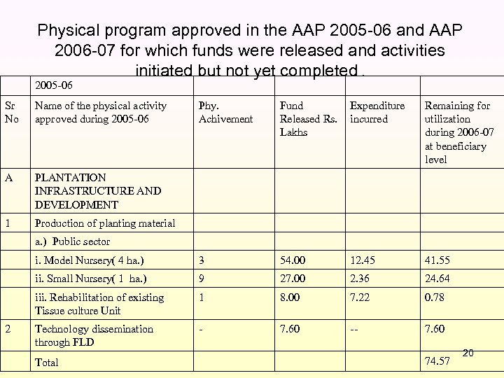 Physical program approved in the AAP 2005 -06 and AAP 2006 -07 for which funds were released and activities initiated but not yet completed. 2005 -06 Sr No Name of the physical activity approved during 2005 -06 Phy. Achivement Fund Expenditure Released Rs. incurred Lakhs Remaining for utilization during 2006 -07 at beneficiary level A PLANTATION INFRASTRUCTURE AND DEVELOPMENT 1 Production of planting material i. Model Nursery( 4 ha. ) 3 54. 00 12. 45 41. 55 ii. Small Nursery( 1 ha. ) 9 27. 00 2. 36 24. 64 iii. Rehabilitation of existing Tissue culture Unit 1 8. 00 7. 22 0. 78 Technology dissemination through FLD - 7. 60 -- 7. 60 a. ) Public sector 2 Total 74. 57 20