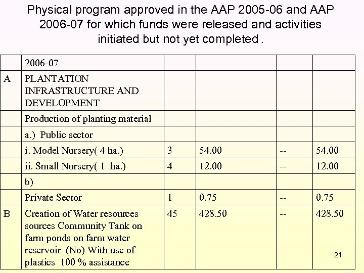 Physical program approved in the AAP 2005 -06 and AAP 2006 -07 for which funds were released and activities initiated but not yet completed. 2006 -07 A PLANTATION INFRASTRUCTURE AND DEVELOPMENT Production of planting material a. ) Public sector i. Model Nursery( 4 ha. ) 3 54. 00 -- 54. 00 ii. Small Nursery( 1 ha. ) 4 12. 00 -- 12. 00 Private Sector 1 0. 75 -- 0. 75 Creation of Water resources Community Tank on farm ponds on farm water reservoir (No) With use of plastics 100 % assistance 45 428. 50 -- 428. 50 b) B 21