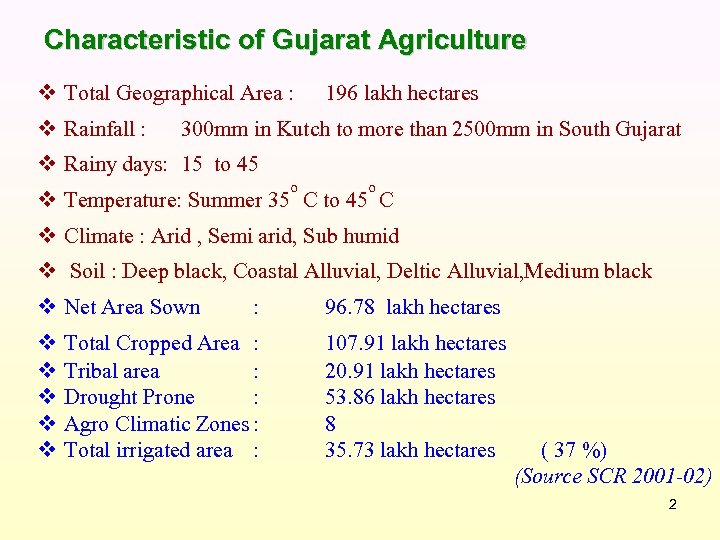 Characteristic of Gujarat Agriculture v Total Geographical Area : v Rainfall : 196 lakh hectares 300 mm in Kutch to more than 2500 mm in South Gujarat v Rainy days: 15 to 45 o o v Temperature: Summer 35 C to 45 C v Climate : Arid , Semi arid, Sub humid v Soil : Deep black, Coastal Alluvial, Deltic Alluvial, Medium black v Net Area Sown v v v : Total Cropped Area : Tribal area : Drought Prone : Agro Climatic Zones : Total irrigated area : 96. 78 lakh hectares 107. 91 lakh hectares 20. 91 lakh hectares 53. 86 lakh hectares 8 35. 73 lakh hectares ( 37 %) (Source SCR 2001 -02) 2