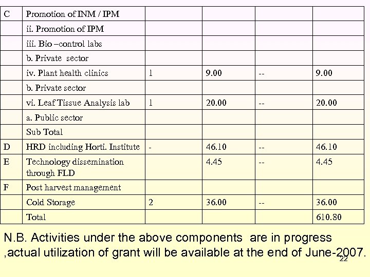 C Promotion of INM / IPM ii. Promotion of IPM iii. Bio –control labs b. Private sector iv. Plant health clinics 1 9. 00 -- 9. 00 1 20. 00 -- 20. 00 D HRD including Horti. Institute - 46. 10 -- 46. 10 E Technology dissemination through FLD 4. 45 -- 4. 45 F Post harvest management 36. 00 -- 36. 00 b. Private sector vi. Leaf Tissue Analysis lab a. Public sector Sub Total Cold Storage Total 2 610. 80 N. B. Activities under the above components are in progress , actual utilization of grant will be available at the end of June-2007. 22