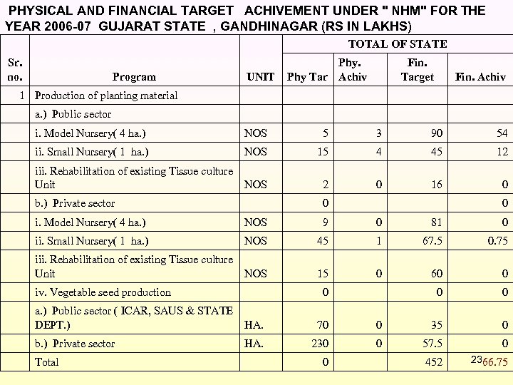 PHYSICAL AND FINANCIAL TARGET ACHIVEMENT UNDER " NHM" FOR THE YEAR 2006 -07 GUJARAT STATE , GANDHINAGAR (RS IN LAKHS) TOTAL OF STATE Sr. no. Program 1 Production of planting material UNIT Phy Tar Achiv Fin. Target Fin. Achiv a. ) Public sector i. Model Nursery( 4 ha. ) NOS 5 3 90 54 ii. Small Nursery( 1 ha. ) NOS 15 4 45 12 iii. Rehabilitation of existing Tissue culture Unit NOS 2 0 16 0 b. ) Private sector 0 i. Model Nursery( 4 ha. ) NOS 9 0 81 0 ii. Small Nursery( 1 ha. ) NOS 45 1 67. 5 0. 75 iii. Rehabilitation of existing Tissue culture Unit NOS 15 0 60 0 iv. Vegetable seed production 0 0 a. ) Public sector ( ICAR, SAUS & STATE DEPT. ) HA. b. ) Private sector HA. Total 0 0 70 0 35 0 230 0 57. 5 0 452 23 66. 75 0