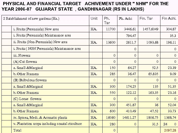 PHYSICAL AND FINANCIAL TARGET ACHIVEMENT UNDER " NHM" FOR THE YEAR 2006 -07 GUJARAT STATE , GANDHINAGAR (RS IN LAKHS) 2 Establishment of new gardens (Ha. ) Unit Ph. Tar Fin. Tar i. Fruits (Perennials) New area HA. i. Fruits (Perennials) Maintanance area ii. Fruits (Non-Perennials) New area HA. i. Fruits ( NON Perennials) Maintanance area iii. Flowers 0 0 (A) Cut flowers 0 0 a. Small &Marginal HA. 150 64. 27 52. 5 23. 39 b. Other Framers HA. 285 36. 47 65. 835 9. 09 (B) Bulbulous flowers 0 0 a. Small &Marginal HA. 300 174. 25 135 51. 35 b. Other Framers HA. 550 122. 12 163. 35 23. 16 (C) Loose flowers 0 0 a. Small &Marginal HA. 300 451. 87 36 52. 04 b. Other Framers HA. 600 410. 49 47. 52 33. 73 iv. Spices, Medi. & Aromatic plants HA. 16060 14611. 27 1806. 75 1368. 74 v. Plantation crops including coastal rticulture HA. 280 0 31. 5 Total Ph. Achi 11700 3446. 61 Fin Achi. 1457. 6049 304. 87 794. 47 13600 2611. 7 35. 3 1093. 68 196. 11 0 0 0 24 0 2097. 28