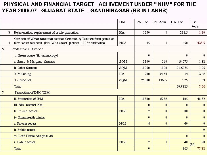 PHYSICAL AND FINANCIAL TARGET ACHIVEMENT UNDER " NHM" FOR THE YEAR 2006 -07 GUJARAT STATE , GANDHINAGAR (RS IN LAKHS) Unit 3 Rejuvenation/ replacement of senile plantation HA. 4 Creation of Water resources Community Tank on farm ponds on farm water reservoir (No) With use of plastics 100 % assistance Ph. Tar NOS Ph. Achi Fin. Tar Fin Achi. 1550 8 232. 5 1. 20 45 1 450 428. 5 0 0 5 Protective cultivation 1. Green house (Hi-technology) 0 a. Small & Marginal farmers SQM 3100 560 10. 075 1. 82 b. Other farmers SQM 10050 1000 21. 6075 1. 25 2. Mulching HA. 200 34. 64 14 2. 46 3. Shade net SQM 75000 13685 5. 25 1. 53 Total 50. 9325 7. 06 7 Promotion of INM / IPM ii. Promotion of IPM HA. 10500 6956 105 48. 32 iii. Bio –control labs 0 0 b. Private sector NOS 2 0 80 0 iv. Plant health clinics 0 0 a. Private sector NOS 4 0 40 0 b. Public sector vi. Leaf Tissue Analysis lab a. Public sector NOS 2 Total 0 0 1 9 40 265 0 25 20 77. 32