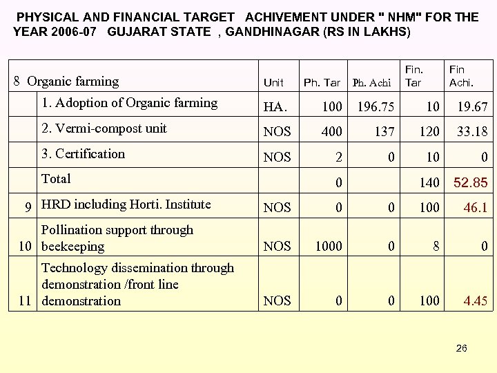PHYSICAL AND FINANCIAL TARGET ACHIVEMENT UNDER " NHM" FOR THE YEAR 2006 -07 GUJARAT STATE , GANDHINAGAR (RS IN LAKHS) 8 Organic farming Unit Ph. Tar Ph. Achi Fin. Tar Fin Achi. 1. Adoption of Organic farming HA. 100 196. 75 10 19. 67 2. Vermi-compost unit NOS 400 137 120 33. 18 3. Certification NOS 2 0 10 0 Total 0 140 52. 85 NOS 0 0 100 46. 1 Pollination support through 10 beekeeping NOS 1000 0 8 0 Technology dissemination through demonstration /front line 11 demonstration NOS 0 0 100 4. 45 9 HRD including Horti. Institute 26