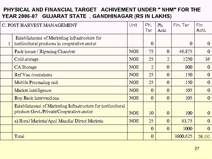 PHYSICAL AND FINANCIAL TARGET ACHIVEMENT UNDER " NHM" FOR THE YEAR 2006 -07 GUJARAT STATE , GANDHINAGAR (RS IN LAKHS) C. POST HARVEST MANAGEMENT Establishment of Marketing infrastructure for 1 horticultural produces in cooperative sector Unit Ph. Tar Ph. Achi 0 Fin. Tar Fin Achi. 0 0 Pack house / Ripening Chamber NOS 75 0 46. 875 0 Cold storage NOS 25 2 1250 36 CA Storage NOS 2 0 800 0 Ref Van /containers NOS 25 0 150 0 Mobile Processing unit NOS 25 0 150 0 Market intelligence NOS 0 0 105 0 Buy Back interventions NOS 0 0 105 0 Establishment of Marketing Infrastructure for horticultural produce Govt. /Private/Cooperative sector NOS 10 0 100 0 a) Rural Markets/Apni Mandis/ Direct Markets NOS 25 0 93. 75 0 0 0 1000 0 Total 0 3800. 625 36. 00 27