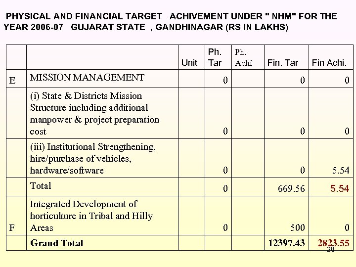 PHYSICAL AND FINANCIAL TARGET ACHIVEMENT UNDER " NHM" FOR THE YEAR 2006 -07 GUJARAT STATE , GANDHINAGAR (RS IN LAKHS) Unit Ph. Tar Ph. Achi Fin. Tar Fin Achi. E MISSION MANAGEMENT 0 0 0 (i) State & Districts Mission Structure including additional manpower & project preparation cost 0 0 0 (iii) Institutional Strengthening, hire/purchase of vehicles, hardware/software 0 0 5. 54 Total 0 669. 56 5. 54 F Integrated Development of horticulture in Tribal and Hilly Areas 0 500 0 Grand Total 12397. 43 2823. 55 28