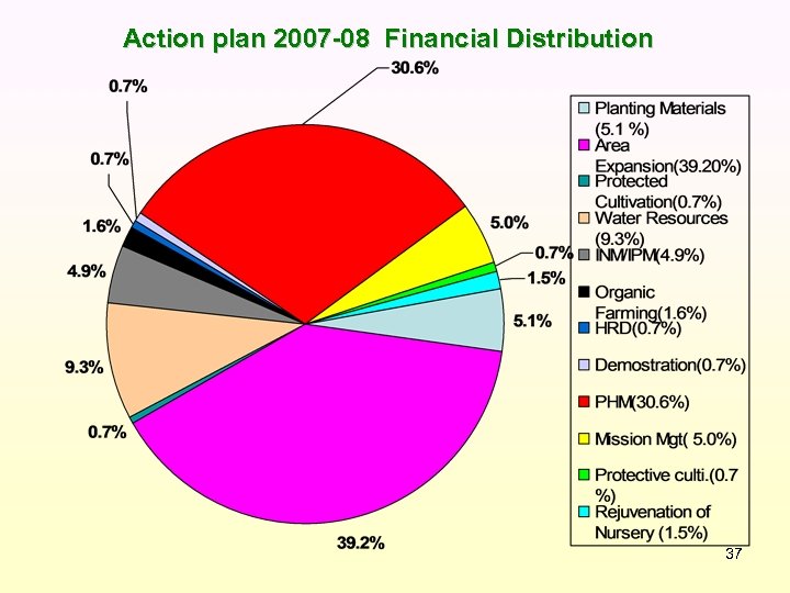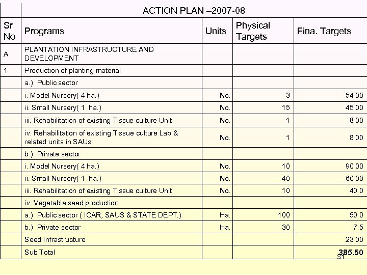ACTION PLAN – 2007 -08 Sr No Programs Physical Targets Fina. Targets A PLANTATION INFRASTRUCTURE AND DEVELOPMENT 1 Production of planting material a. ) Public sector i. Model Nursery( 4 ha. ) No. 3 54. 00 ii. Small Nursery( 1 ha. ) No. 15 45. 00 iii. Rehabilitation of existing Tissue culture Unit No. 1 8. 00 iv. Rehabilitation of existing Tissue culture Lab & related units in SAUs No. 1 8. 00 Units b. ) Private sector i. Model Nursery( 4 ha. ) No. 10 90. 00 ii. Small Nursery( 1 ha. ) No. 40 60. 00 iii. Rehabilitation of existing Tissue culture Unit No. 10 40. 0 iv. Vegetable seed production a. ) Public sector ( ICAR, SAUS & STATE DEPT. ) Ha. 100 50. 0 b. ) Private sector Ha. 30 7. 5 Seed Infrastructure Sub Total 23. 00 385. 50 31