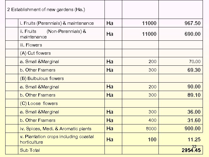 2 Establishment of new gardens (Ha. ) i. Fruits (Perennials) & maintenance Ha 11000 967. 50 ii. Fruits (Non-Perennials) & maintenance Ha 11000 690. 00 iii. Flowers (A) Cut flowers a. Small &Marginal Ha 200 70. 00 b. Other Framers Ha 300 69. 30 (B) Bulbulous flowers a. Small &Marginal Ha 200 90. 00 b. Other Framers Ha 300 89. 10 (C) Loose flowers a. Small &Marginal Ha 300 36. 00 b. Other Framers Ha 400 31. 60 iv. Spices, Medi. & Aromatic plants Ha 8000 900. 00 v. Plantation crops including coastal horticulture Ha 100 11. 25 Sub Total 32 2954. 45