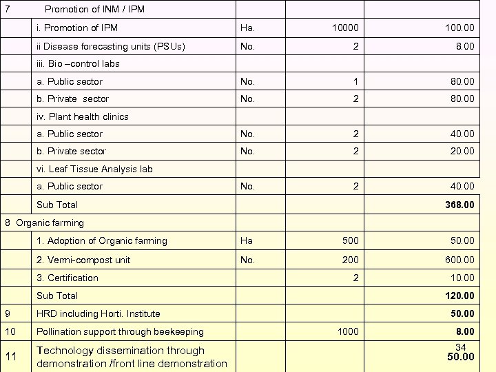 7 Promotion of INM / IPM i. Promotion of IPM Ha. 10000 100. 00 ii Disease forecasting units (PSUs) No. 2 8. 00 a. Public sector No. 1 80. 00 b. Private sector No. 2 80. 00 iv. Plant health clinics a. Public sector No. 2 40. 00 b. Private sector No. 2 20. 00 vi. Leaf Tissue Analysis lab a. Public sector No. 2 40. 00 Sub Total iii. Bio –control labs 368. 00 8 Organic farming 1. Adoption of Organic farming Ha 500 50. 00 2. Vermi-compost unit No. 200 600. 00 3. Certification 2 10. 00 Sub Total 9 HRD including Horti. Institute 10 Pollination support through beekeeping 11 Technology dissemination through demonstration /front line demonstration 120. 00 50. 00 1000 8. 00 34 50. 00