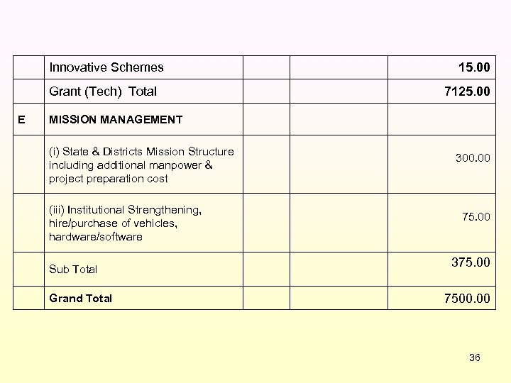 Innovative Schemes 15. 00 Grant (Tech) Total 7125. 00 E MISSION MANAGEMENT (i) State & Districts Mission Structure including additional manpower & project preparation cost 300. 00 (iii) Institutional Strengthening, hire/purchase of vehicles, hardware/software 75. 00 Sub Total Grand Total 375. 00 7500. 00 36