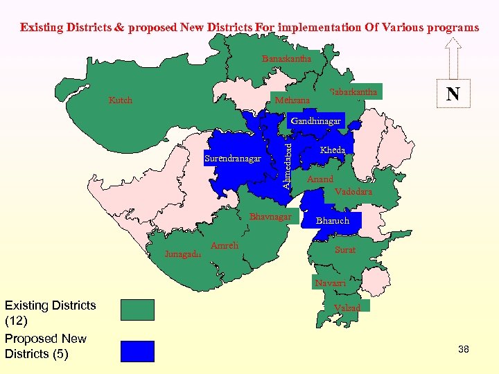 Existing Districts & proposed New Districts For implementation Of Various programs Banaskantha Kutch Mehsana Sabarkantha N Surendranagar Ahmedabad Gandhinagar Bhavnagar Junagadh Amreli Kheda Anand Vadodara Bharuch Surat Navasri Existing Districts (12) Proposed New Districts (5) Valsad 38