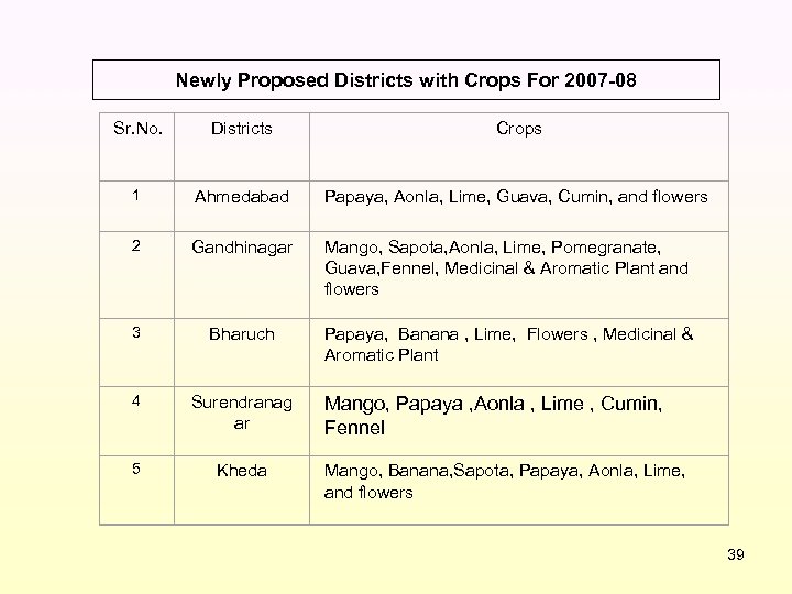 Newly Proposed Districts with Crops For 2007 -08 Sr. No. Districts Crops 1 Ahmedabad Papaya, Aonla, Lime, Guava, Cumin, and flowers 2 Gandhinagar Mango, Sapota, Aonla, Lime, Pomegranate, Guava, Fennel, Medicinal & Aromatic Plant and flowers 3 Bharuch Papaya, Banana , Lime, Flowers , Medicinal & Aromatic Plant 4 Surendranag ar 5 Kheda Mango, Papaya , Aonla , Lime , Cumin, Fennel Mango, Banana, Sapota, Papaya, Aonla, Lime, and flowers 39