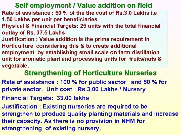 Self employment / Value addition on field Rate of assistance : 50 % of the cost of Rs. 3. 0 Lakhs i. e. 1. 50 Lakhs per unit per beneficiaries Physical & Financial Targets: 25 units with the total financial outlay of Rs. 37. 5 Lakhs Justification : Value addition is the prime requirement in Horticulture considering this & to create additional employment by establishing small scale on farm distillation unit for aromatic plant and processing units for fruits/nuts & vegetable. Strengthening of Horticulture Nurseries Rate of assistance : 100 % for public sector and 50 % for private sector. Unit cost : Rs. 3. 00 Lakhs / Nursery Financial Targets: 33. 00 lakhs Justification : Existing nurseries are required to be strengthen to produce quality planting materials and increase their capacity. As there is no provision in NHM for strengthening of existing nursery.