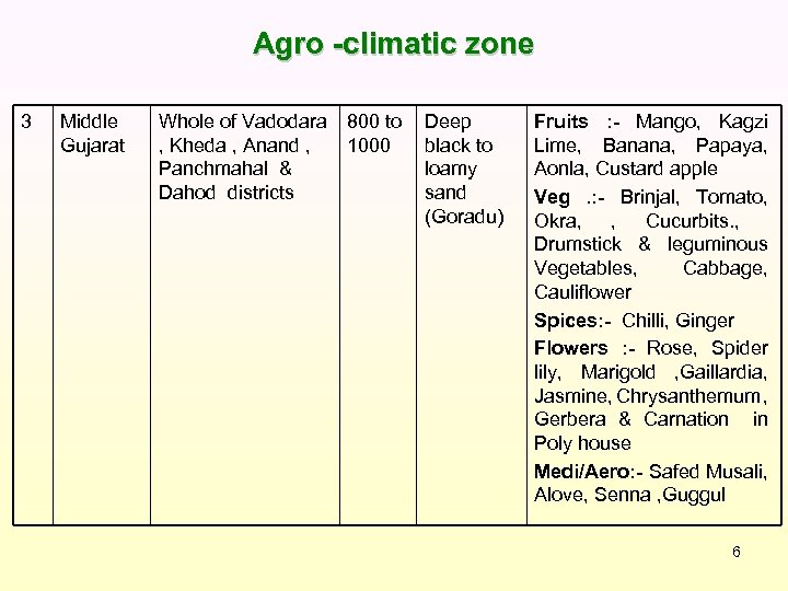 Agro -climatic zone 3 Middle Gujarat Whole of Vadodara 800 to Deep , Kheda , Anand , 1000 black to Panchmahal & loamy Dahod districts sand (Goradu) Fruits : - Mango, Kagzi Lime, Banana, Papaya, Aonla, Custard apple Veg . : - Brinjal, Tomato, Okra, , Cucurbits. , Drumstick & leguminous Vegetables, Cabbage, Cauliflower Spices: - Chilli, Ginger Flowers : - Rose, Spider lily, Marigold , Gaillardia, Jasmine, Chrysanthemum , Gerbera & Carnation in Poly house Medi/Aero: - Safed Musali, Alove, Senna , Guggul 6