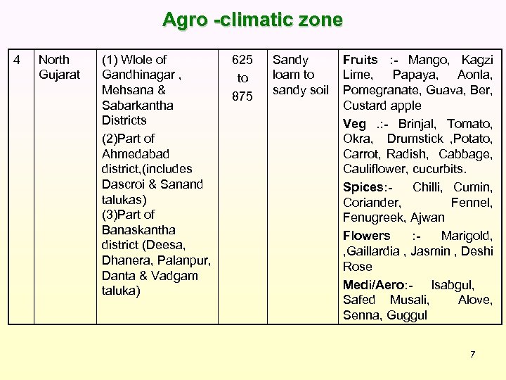 Agro -climatic zone 4 North Gujarat (1) Wlole of Gandhinagar , Mehsana & Sabarkantha Districts (2)Part of Ahmedabad district, (includes Dascroi & Sanand talukas) (3)Part of Banaskantha district (Deesa, Dhanera, Palanpur, Danta & Vadgam taluka) 625 to 875 Sandy loam to sandy soil Fruits : - Mango, Kagzi Lime, Papaya, Aonla, Pomegranate, Guava, Ber, Custard apple Veg . : - Brinjal, Tomato, Okra, Drumstick , Potato, Carrot, Radish, Cabbage, Cauliflower, cucurbits. Spices: - Chilli, Cumin, Coriander, Fennel, Fenugreek, Ajwan Flowers : - Marigold, , Gaillardia , Jasmin , Deshi Rose Medi/Aero: - Isabgul, Safed Musali, Alove, Senna, Guggul 7