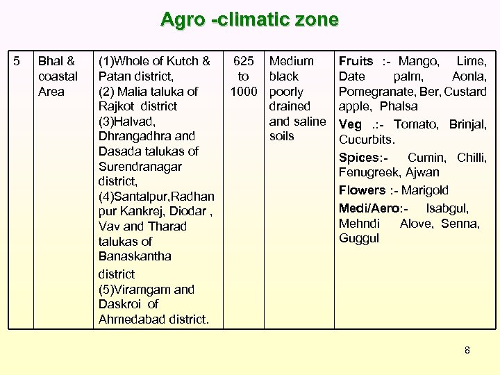 Agro -climatic zone 5 Bhal & coastal Area (1)Whole of Kutch & Patan district, (2) Malia taluka of Rajkot district (3)Halvad, Dhrangadhra and Dasada talukas of Surendranagar district, (4)Santalpur, Radhan pur Kankrej, Diodar , Vav and Tharad talukas of Banaskantha district (5)Viramgam and Daskroi of Ahmedabad district. 625 Medium to black 1000 poorly drained and saline soils Fruits : - Mango, Lime, Date palm, Aonla, Pomegranate, Ber, Custard apple, Phalsa Veg . : - Tomato, Brinjal, Cucurbits. Spices: - Cumin, Chilli, Fenugreek, Ajwan Flowers : - Marigold Medi/Aero: - Isabgul, Mehndi Alove, Senna, Guggul 8
