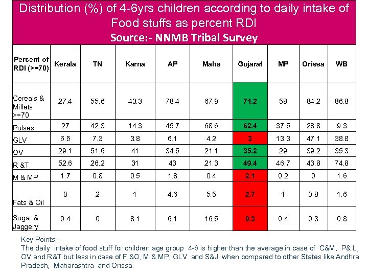 Distribution (%) of 4 -6 yrs children according to daily intake of Food stuffs as percent RDI Source: - NNMB Tribal Survey Percent of Kerala RDI (>=70) TN Karna AP Maha Gujarat MP Orissa WB 27. 4 55. 6 43. 3 78. 4 67. 9 71. 2 58 84. 2 86. 8 Pulses 27 42. 3 14. 3 45. 7 68. 6 62. 4 37. 5 28. 8 9. 3 GLV 6. 5 7. 3 3. 8 6. 1 4. 2 3 13. 3 47. 1 38. 8 OV 29. 1 51. 6 41 34. 5 21. 1 35. 2 29 39. 2 35. 3 R &T 52. 6 26. 2 31 43 21. 3 49. 4 46. 7 43. 8 74. 8 M & MP 1. 7 0. 8 0. 5 1. 8 0. 4 2. 1 0. 2 0 1. 6 0 2 1 4. 6 5. 5 2. 7 1 0. 8 1. 6 0. 4 0 8. 1 6. 1 16. 5 0. 3 0. 4 0. 3 0. 8 Cereals & Millets >=70 Fats & Oil Sugar & Jaggery Key Points: The daily intake of food stuff for children age group 4 -6 is higher than the average in case of C&M, P& L, OV and R&T but less in case of F &O, M & MP, GLV and S&J. when compared to other States like Andhra Pradesh, Maharashtra and Orissa.