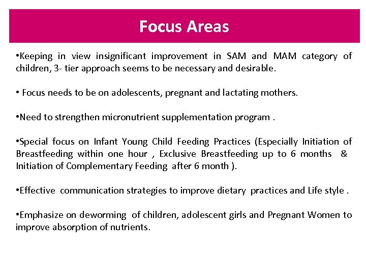 Focus Areas • Keeping in view insignificant improvement in SAM and MAM category of children, 3 - tier approach seems to be necessary and desirable. • Focus needs to be on adolescents, pregnant and lactating mothers. • Need to strengthen micronutrient supplementation program. • Special focus on Infant Young Child Feeding Practices (Especially Initiation of Breastfeeding within one hour , Exclusive Breastfeeding up to 6 months & Initiation of Complementary Feeding after 6 month ). • Effective communication strategies to improve dietary practices and Life style. • Emphasize on deworming of children, adolescent girls and Pregnant Women to improve absorption of nutrients.