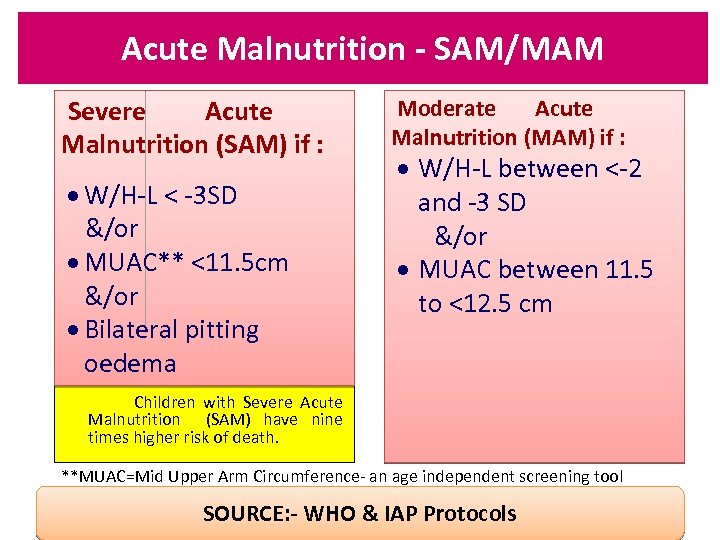 Acute Malnutrition - SAM/MAM Severe Acute Malnutrition (SAM) if : · W/H-L < -3 SD &/or · MUAC** <11. 5 cm &/or · Bilateral pitting oedema Moderate Acute Malnutrition (MAM) if : · W/H-L between <-2 and -3 SD &/or · MUAC between 11. 5 to <12. 5 cm Children with Severe Acute Malnutrition (SAM) have nine times higher risk of death. **MUAC=Mid Upper Arm Circumference- an age independent screening tool SOURCE: - WHO & IAP Protocols