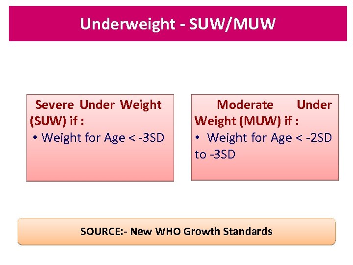 Underweight - SUW/MUW Severe Under Weight (SUW) if : • Weight for Age < -3 SD Moderate Under Weight (MUW) if : • Weight for Age < -2 SD to -3 SD SOURCE: - New WHO Growth Standards