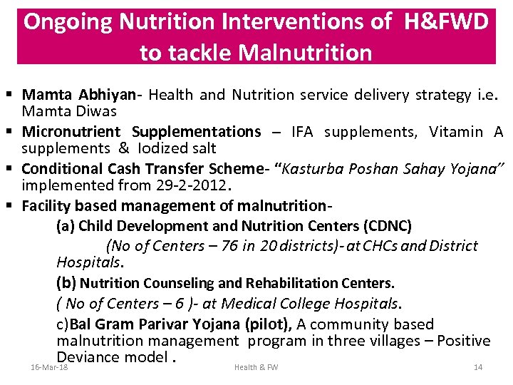 Ongoing Nutrition Interventions of H&FWD to tackle Malnutrition § Mamta Abhiyan- Health and Nutrition service delivery strategy i. e. Mamta Diwas § Micronutrient Supplementations – IFA supplements, Vitamin A supplements & Iodized salt § Conditional Cash Transfer Scheme- “Kasturba Poshan Sahay Yojana” implemented from 29 -2 -2012. § Facility based management of malnutrition(a) Child Development and Nutrition Centers (CDNC) (No of Centers – 76 in 20 districts)- at CHCs and District Hospitals. (b) Nutrition Counseling and Rehabilitation Centers. ( No of Centers – 6 )- at Medical College Hospitals. c)Bal Gram Parivar Yojana (pilot), A community based malnutrition management program in three villages – Positive Deviance model. 16 -Mar-18 Health & FW 14