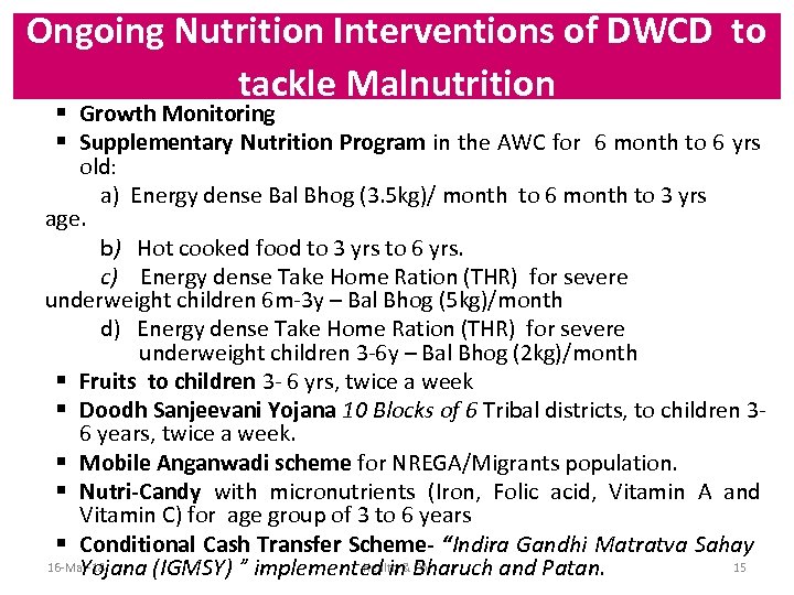 Ongoing Nutrition Interventions of DWCD to tackle Malnutrition § Growth Monitoring § Supplementary Nutrition Program in the AWC for 6 month to 6 yrs old: a) Energy dense Bal Bhog (3. 5 kg)/ month to 6 month to 3 yrs age. b) Hot cooked food to 3 yrs to 6 yrs. c) Energy dense Take Home Ration (THR) for severe underweight children 6 m-3 y – Bal Bhog (5 kg)/month d) Energy dense Take Home Ration (THR) for severe underweight children 3 -6 y – Bal Bhog (2 kg)/month § Fruits to children 3 - 6 yrs, twice a week § Doodh Sanjeevani Yojana 10 Blocks of 6 Tribal districts, to children 36 years, twice a week. § Mobile Anganwadi scheme for NREGA/Migrants population. § Nutri-Candy with micronutrients (Iron, Folic acid, Vitamin A and Vitamin C) for age group of 3 to 6 years § Conditional Cash Transfer Scheme- “Indira Gandhi Matratva Sahay 16 -Mar-18 Health & FW 15 Yojana (IGMSY) ” implemented in Bharuch and Patan.