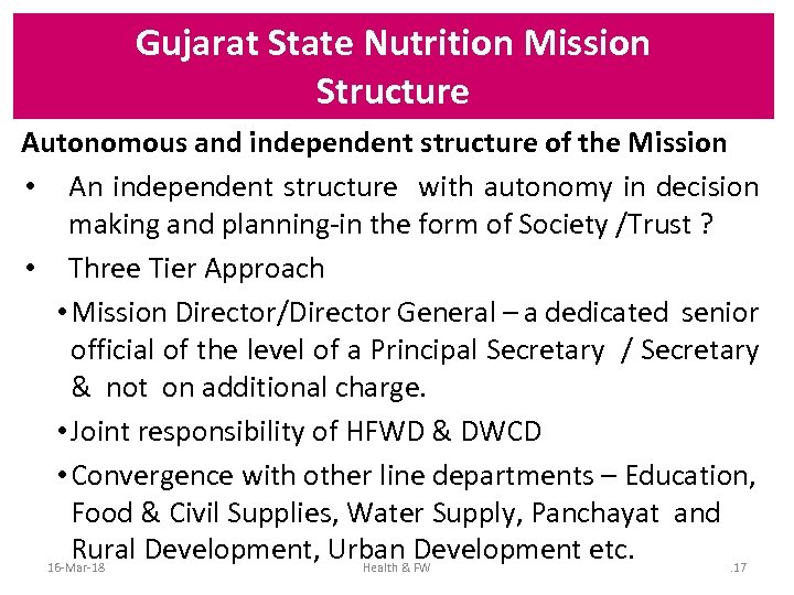 Gujarat State Nutrition Mission Structure Autonomous and independent structure of the Mission • An independent structure with autonomy in decision making and planning-in the form of Society /Trust ? • Three Tier Approach • Mission Director/Director General – a dedicated senior official of the level of a Principal Secretary / Secretary & not on additional charge. • Joint responsibility of HFWD & DWCD • Convergence with other line departments – Education, Food & Civil Supplies, Water Supply, Panchayat and Rural Development, Urban Development etc. 16 -Mar-18 Health & FW. 17