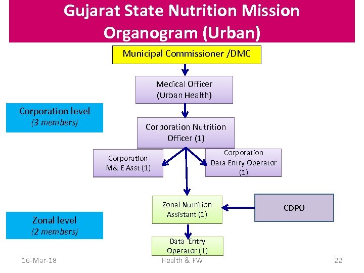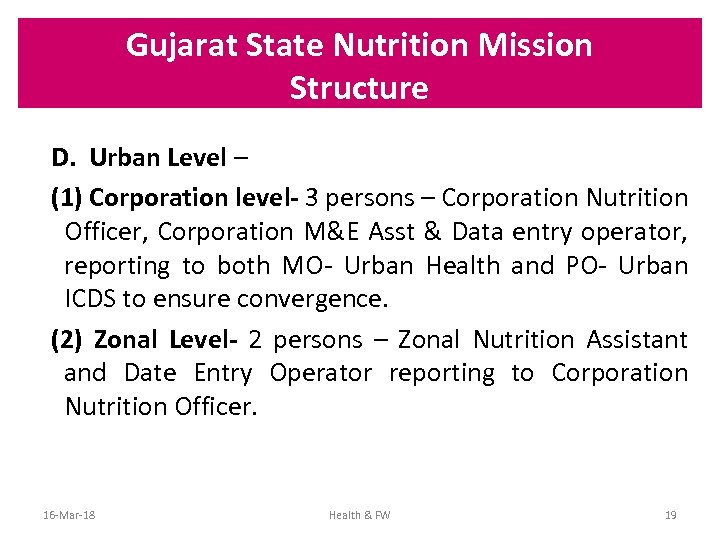 Gujarat State Nutrition Mission Structure D. Urban Level – (1) Corporation level- 3 persons – Corporation Nutrition Officer, Corporation M&E Asst & Data entry operator, reporting to both MO- Urban Health and PO- Urban ICDS to ensure convergence. (2) Zonal Level- 2 persons – Zonal Nutrition Assistant and Date Entry Operator reporting to Corporation Nutrition Officer. 16 -Mar-18 Health & FW 19
