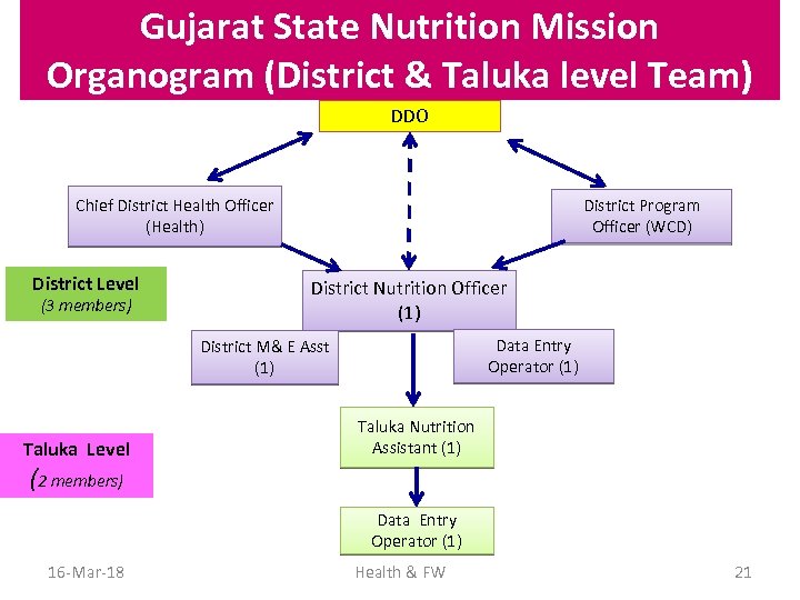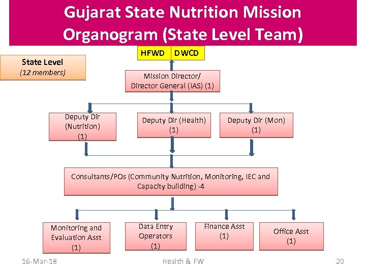 Gujarat State Nutrition Mission Structure The operational structure of the Mission should include A. State Level – 12 persons - Mission Director/Director General (IAS), Deputy Directors-3, Consultants and Project Officers -4, M&E Asst. -1, Data Entry Operators 2, Finance Asst. -1, Office Asst-1. Aim is to have specialists on board. B. District Level- 3 persons – District Nutrition Officer, Dist. M&E Asst. , Data entry operator, reporting to both CDHO and PO- ICDS to ensure convergence. C. Taluka Level- 2 persons – Taluka Nutrition Assistant, Date Entry Operator reporting to Taluka Health Officer 16 -Mar-18 Health & FW 18 and designate Taluka CDPO.
