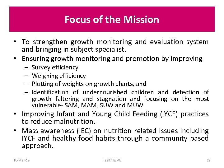 Focus of the Mission • To strengthen growth monitoring and evaluation system and bringing in subject specialist. • Ensuring growth monitoring and promotion by improving – – Survey efficiency Weighing efficiency Plotting of weights on growth charts, and Identification of undernourished children and detection of growth faltering and stagnation and focusing on the most vulnerable- SAM, MAM, SUW and MUW • Improving Infant and Young Child Feeding (IYCF) practices to reduce malnutrition. • Mass awareness (IEC) on nutrition related issues including IYCF and healthy food habits through a community based approach. 16 -Mar-18 Health & FW 23
