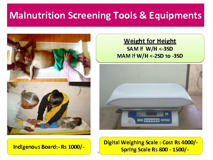 Malnutrition Screening Tools & Equipments Weight for Height SAM if W/H <-3 SD MAM if W/H <-2 SD to -3 SD Indigenous Board: - Rs 1000/16 -Mar-18 Digital Weighing Scale : Cost Rs 4000/Spring Scale Rs 800 - 1500/- 24 Health & FW