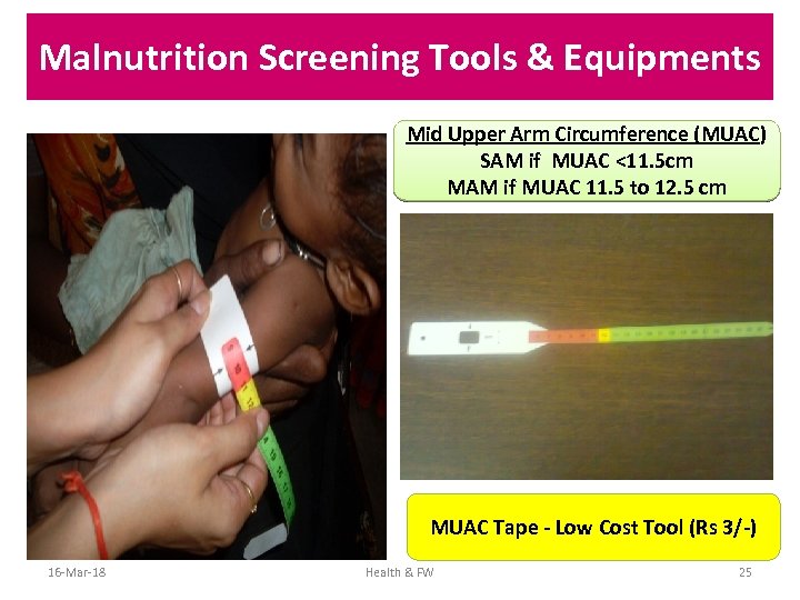 Malnutrition Screening Tools & Equipments Mid Upper Arm Circumference (MUAC) SAM if MUAC <11. 5 cm MAM if MUAC 11. 5 to 12. 5 cm MUAC Tape - Low Cost Tool (Rs 3/-) 16 -Mar-18 Health & FW 25