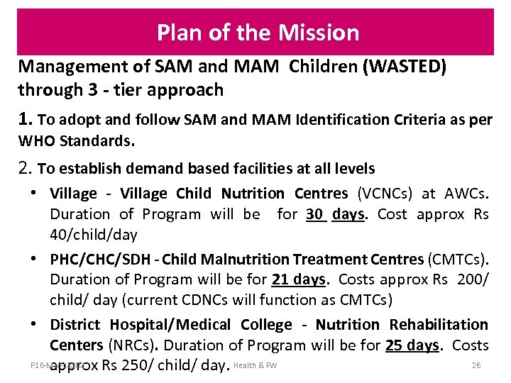 Plan of the Mission Management of SAM and MAM Children (WASTED) through 3 - tier approach 1. To adopt and follow SAM and MAM Identification Criteria as per WHO Standards. 2. To establish demand based facilities at all levels • Village - Village Child Nutrition Centres (VCNCs) at AWCs. Duration of Program will be for 30 days. Cost approx Rs 40/child/day • PHC/CHC/SDH - Child Malnutrition Treatment Centres (CMTCs). Duration of Program will be for 21 days. Costs approx Rs 200/ child/ day (current CDNCs will function as CMTCs) • District Hospital/Medical College - Nutrition Rehabilitation Centers (NRCs). Duration of Program will be for 25 days. Costs P 16 -Mar-18202 26 approx Rs 250/ child/ day. Health & FW