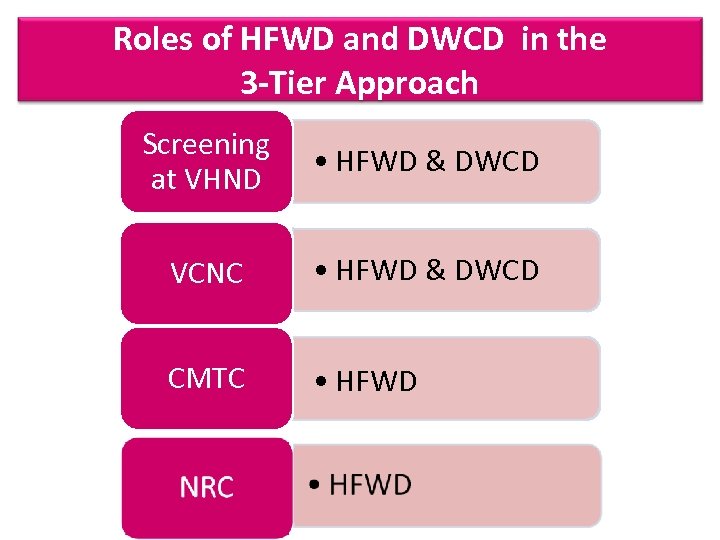 Roles of HFWD and DWCD in the 3 -Tier Approach Screening at VHND • HFWD & DWCD VCNC • HFWD & DWCD CMTC • HFWD
