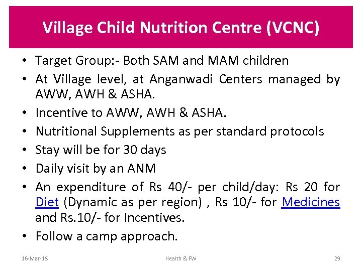 Village Child Nutrition Centre (VCNC) • Target Group: - Both SAM and MAM children • At Village level, at Anganwadi Centers managed by AWW, AWH & ASHA. • Incentive to AWW, AWH & ASHA. • Nutritional Supplements as per standard protocols • Stay will be for 30 days • Daily visit by an ANM • An expenditure of Rs 40/- per child/day: Rs 20 for Diet (Dynamic as per region) , Rs 10/- for Medicines and Rs. 10/- for Incentives. • Follow a camp approach. 16 -Mar-18 Health & FW 29
